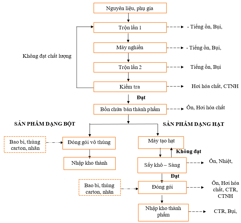 Quá trình thực hiện phát sinh bụi, tiếng ồn và mùi hóa chất, đối với các sản phẩm không đạt yêu cầu về kích thước sẽ được cho quay lại công đoạn nghiền và công đoạn trộn liệu cho các mẻ sản xuất kế tiếp.